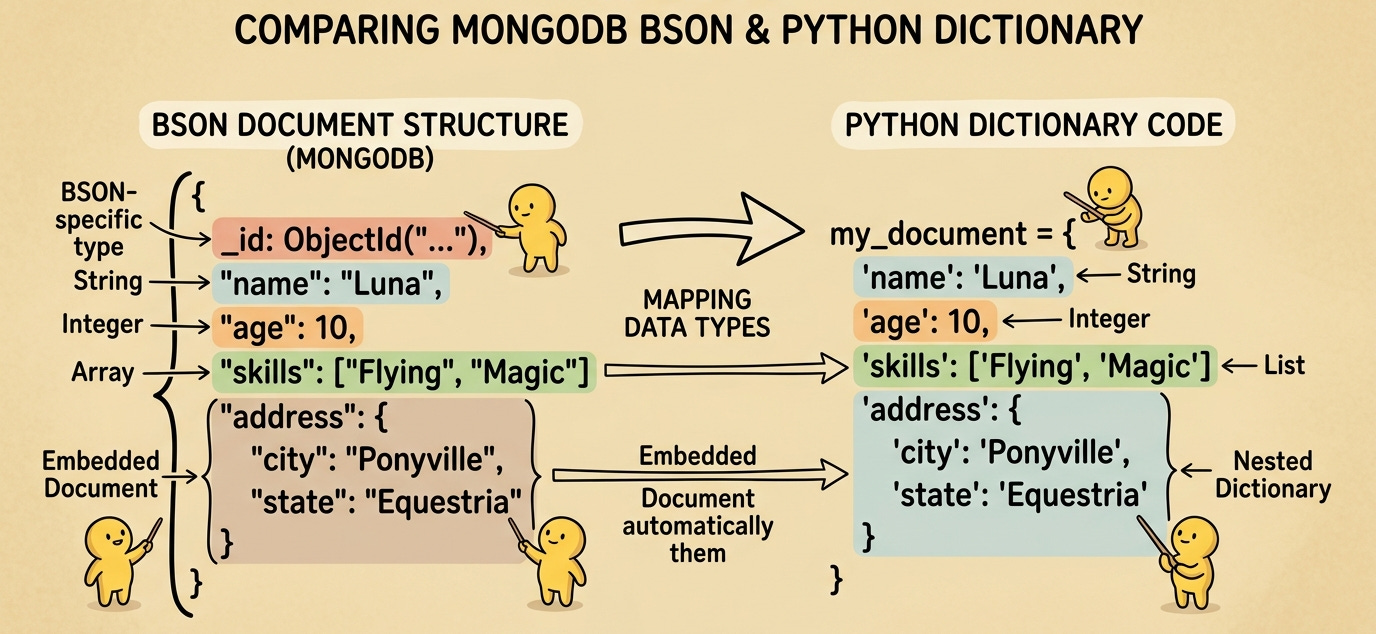 It is incredibly easy to blur the lines between the two, especially when you are using a library like PyMongo that seamlessly bridges the gap. However, assuming a Python dictionary and a MongoDB Document are exactly the same thing can lead to some tricky bugs down the road.