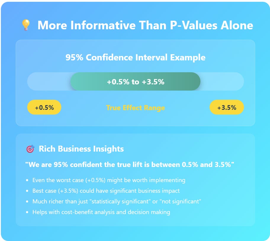 While p-values are a useful starting point, they can feel like a blunt “yes/no” tool. That’s why many practitioners prefer confidence intervals, which offer a richer perspective. For example, instead of simply declaring “the effect is significant”, you might calculate a 95% confidence interval for the difference between groups and get something like [+0.5%, +3.5%]. This tells you that, with high confidence, the true improvement lies somewhere in that range—a far more actionable insight than a binary verdict.