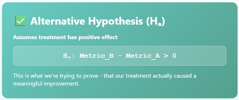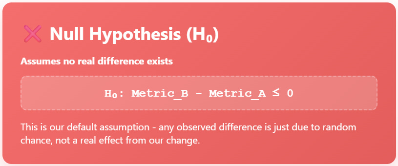 The Null Hypothesis (H₀): By default, we assume there is no difference between the control and the treatment. In other words, the treatment did not improve the metric. Formally, this might look like: