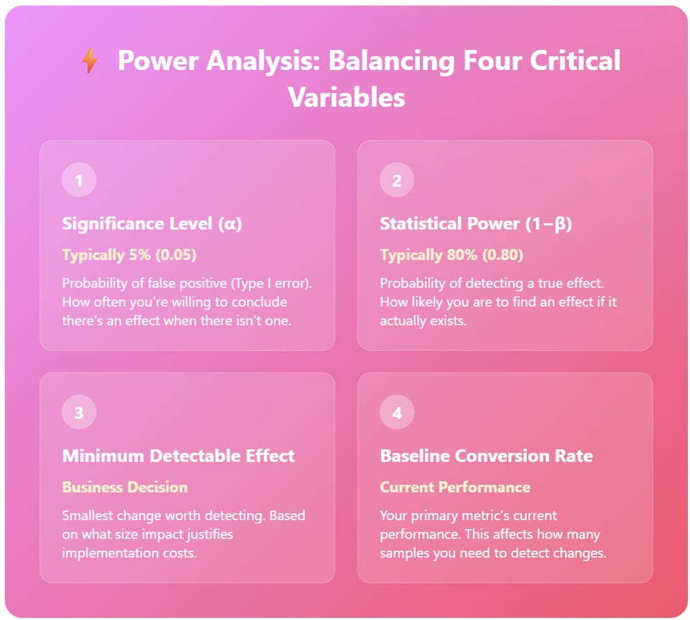 Finally, you need to make sure your experiment includes enough data to detect meaningful differences. This is where power analysis comes into play. It balances four interconnected elements: