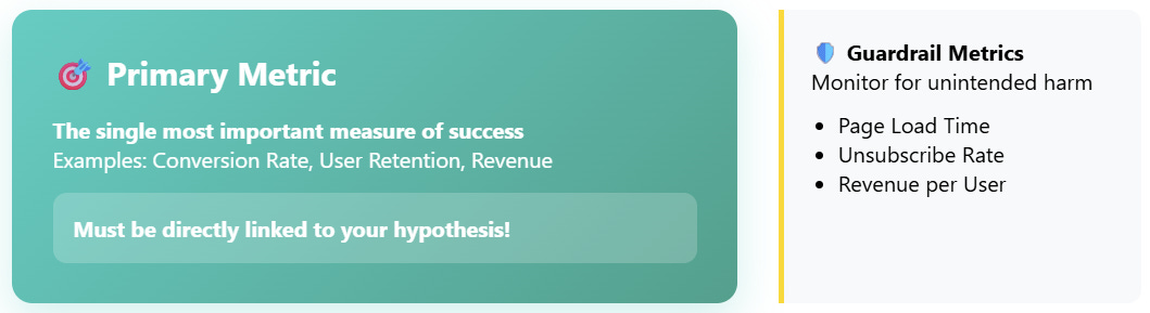 Primary Metric: This is the single most important outcome that will tell you whether your hypothesis holds. Think of it as the “north star” of your test. For example, you might care about conversion rate, user retention, or revenue per visitor. Whatever you choose, it should be tightly linked to your hypothesis and reflect the change you want to drive.