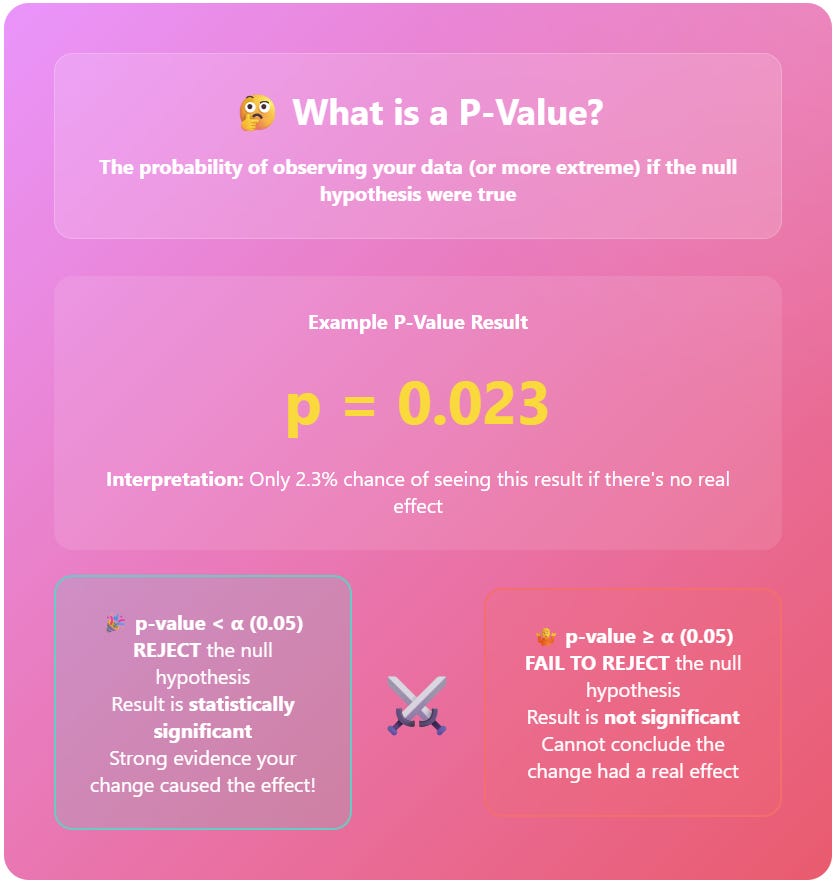 If the p-value < α (say, less than 0.05), you reject the null hypothesis. In plain terms, the data provides strong evidence that your change really did have an effect.