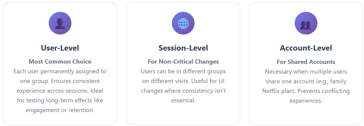 Account-level randomization: In products where multiple people share the same account—think of a family Netflix subscription—assigning treatments at the account level avoids conflicts and keeps the shared experience consistent.