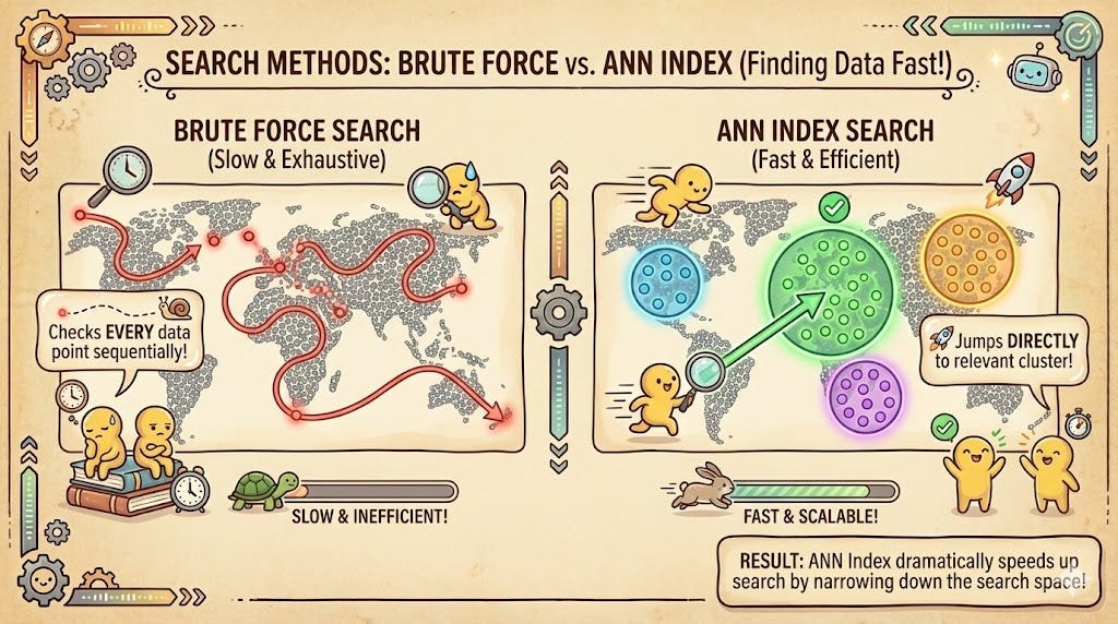 However, as your data grows to millions of rows, brute force becomes a bottleneck. To solve this, we use Approximate Nearest Neighbor (ANN) algorithms. These algorithms trade a tiny bit of accuracy for massive gains in speed by organizing the vectors into searchable structures. Instead of checking every dot on the map, the system jumps to the “neighborhood” where your query is most likely to reside.