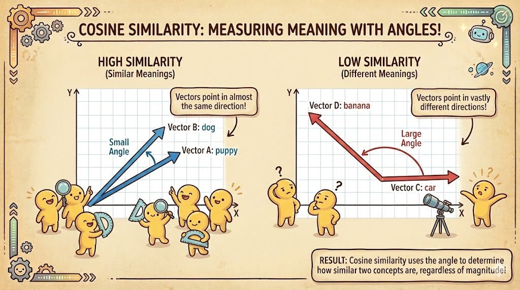 If the angle is 0°, the cosine is 1, meaning the meanings are identical. If the angle is 90°, the cosine is 0, meaning they are completely unrelated. This is vital for text because a short sentence like “I love dogs” and a long, wordy paragraph about a passion for dogs should be considered similar. Cosine similarity ignores the “length” of the vector and focuses purely on the direction of the meaning.