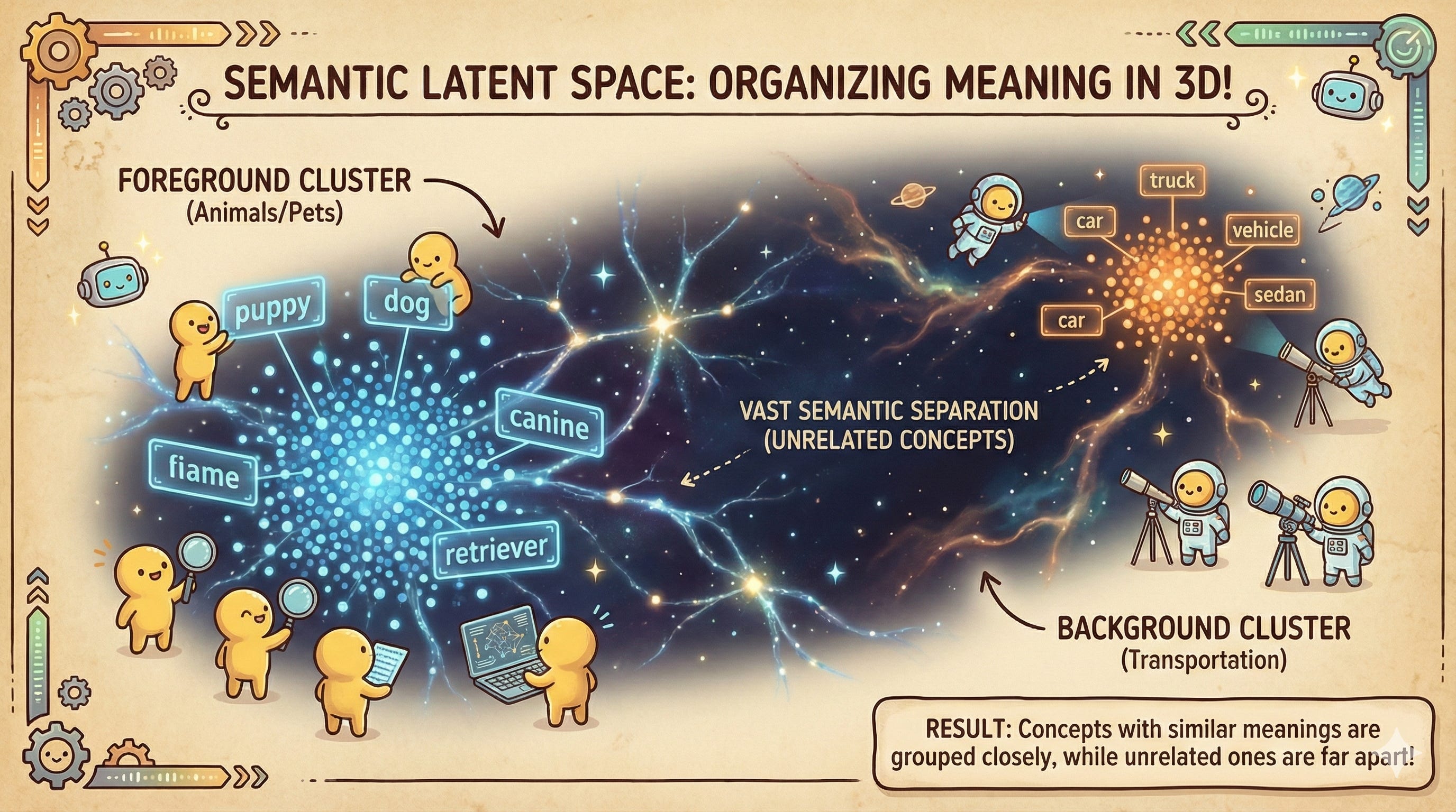 In this space—often called a “latent space”—concepts that are semantically similar are grouped physically close together. Imagine a 3D globe where “King” and “Queen” sit on the same island, while “Apple” (the fruit) is on a completely different continent than “Apple” (the tech company).