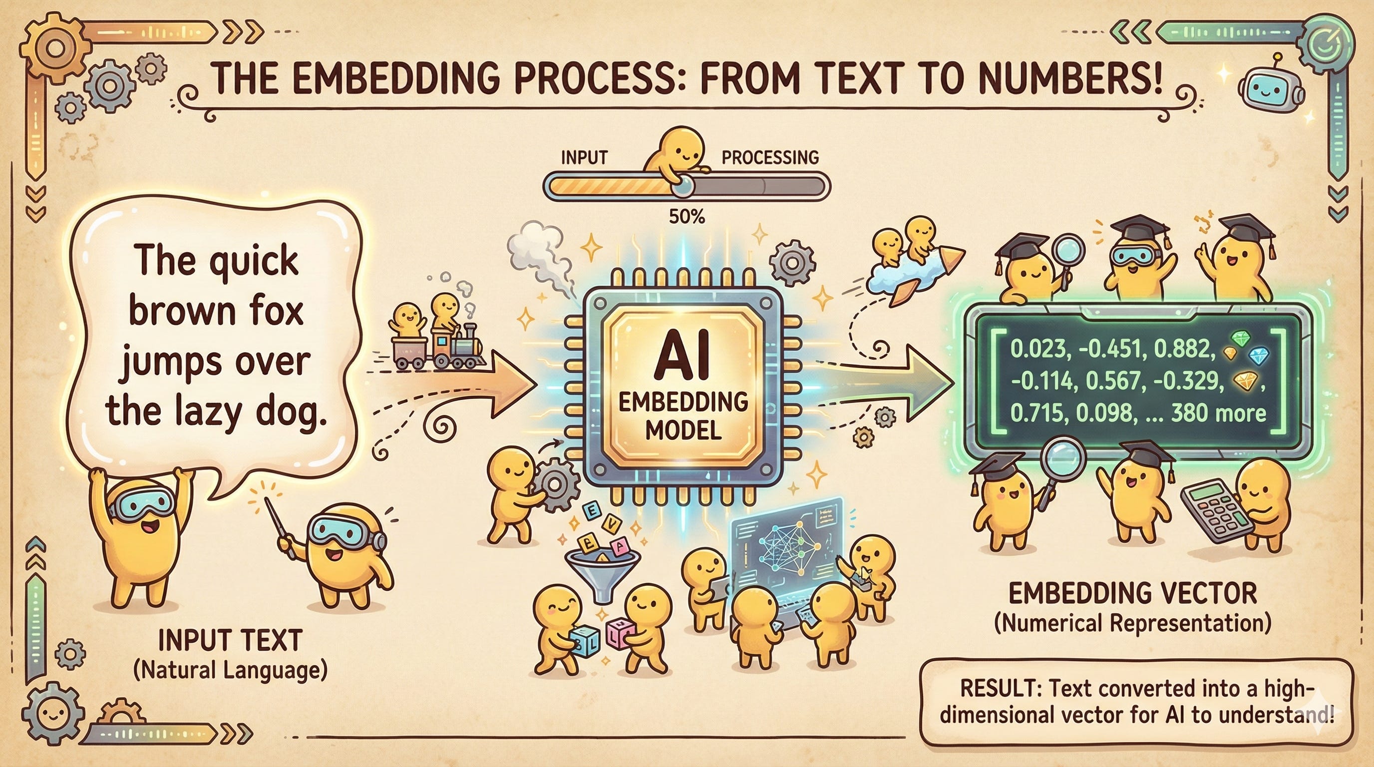 An embedding is a list of floating-point numbers (coordinates) that represents the semantic meaning of the data in that high-dimensional space. This translation is performed by an Embedding Model (like OpenAI’s text-embedding-3 or open-source models from Hugging Face).