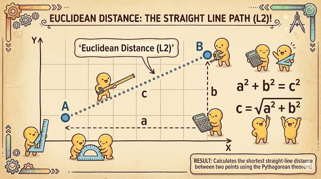 Euclidean distance is the “as the crow flies” measurement. It calculates the square root of the sum of the squared differences between two vectors. In a 2D space, this is simply the Pythagorean theorem applied to coordinates.