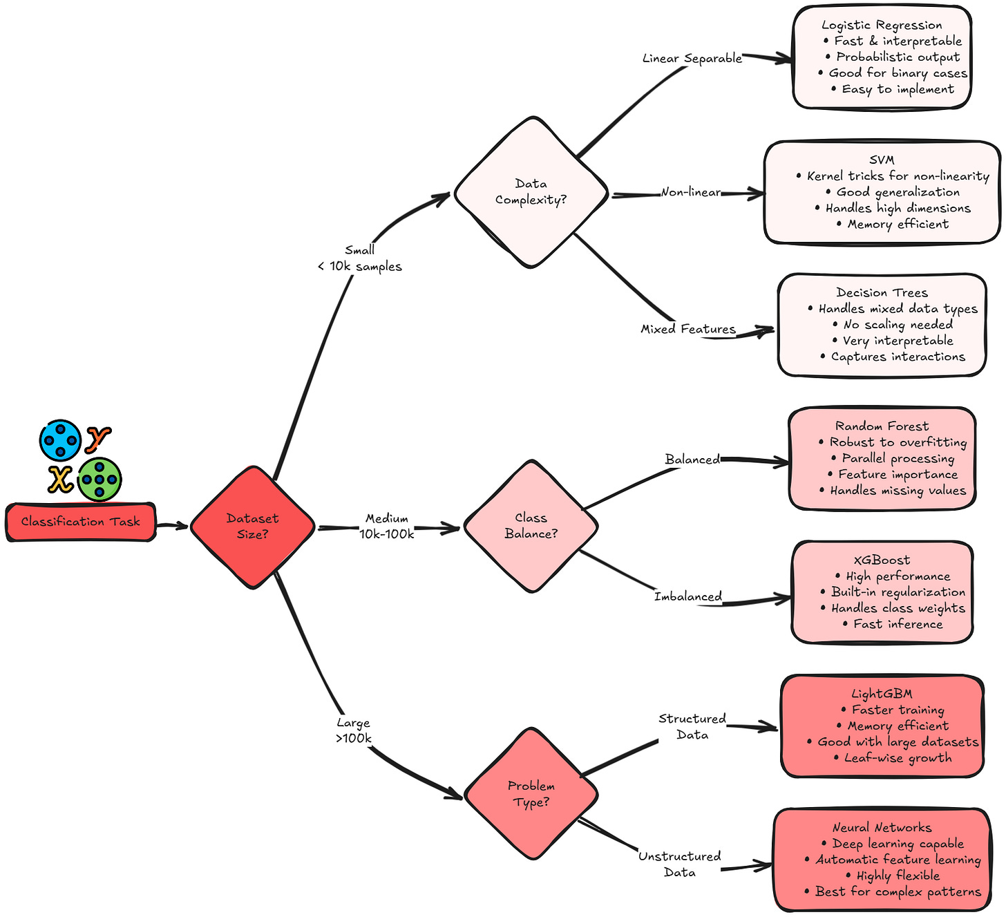 Classification problems involve predicting discrete categories. The choice of model depends on factors like dataset size, feature complexity, and interpretability needs.