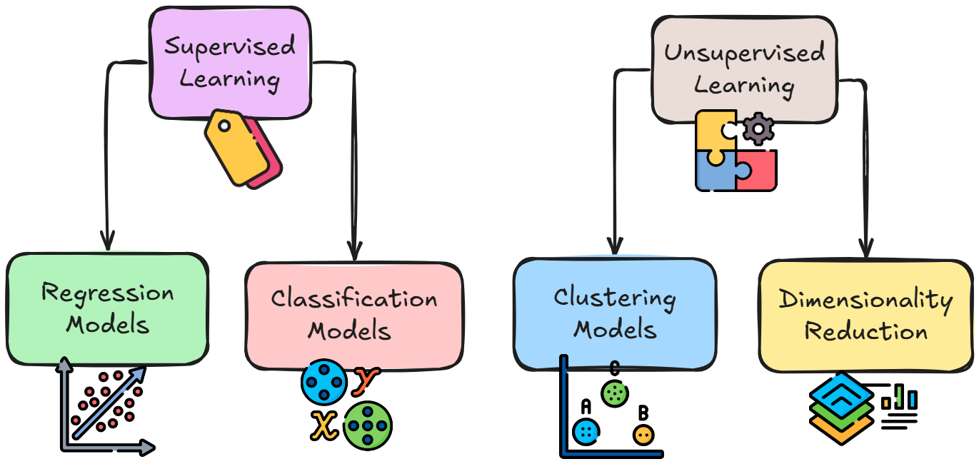 In supervised learning, you have labeled data that shows the correct answers your model should predict. These problems further divide into: