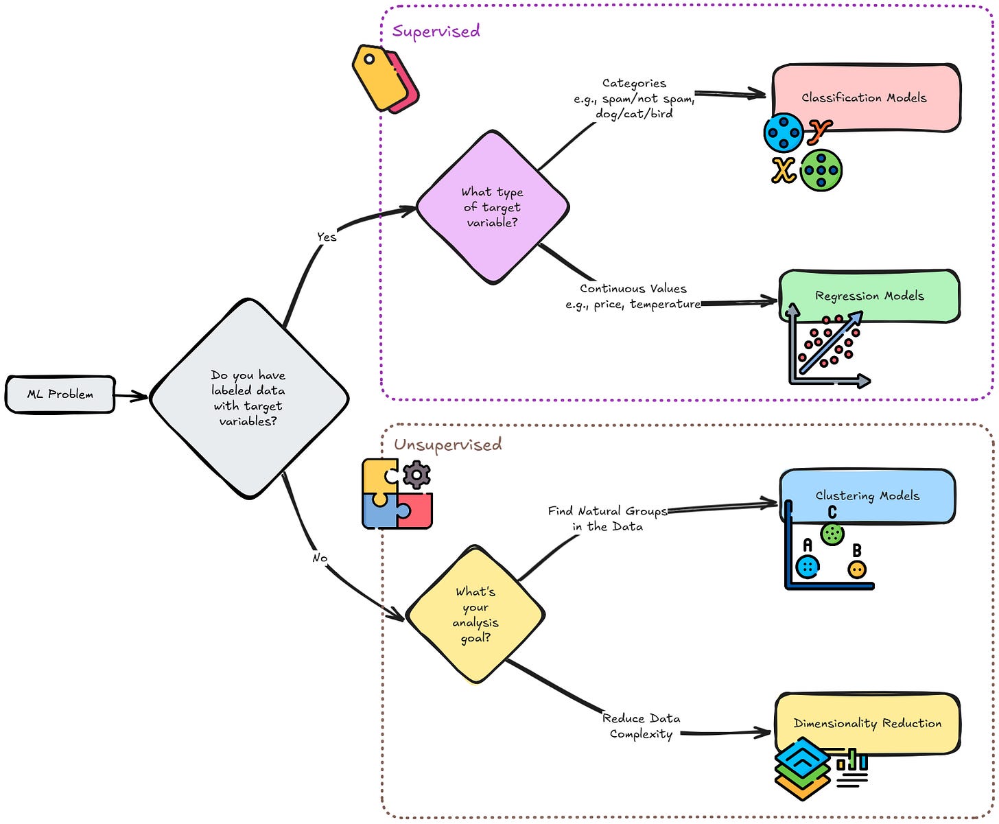 To help you make an informed decision, here’s a structured approach to selecting the right machine learning model. This decision-making process ensures you consider key factors such as the availability of labeled data, the type of problem, and interpretability requirements.