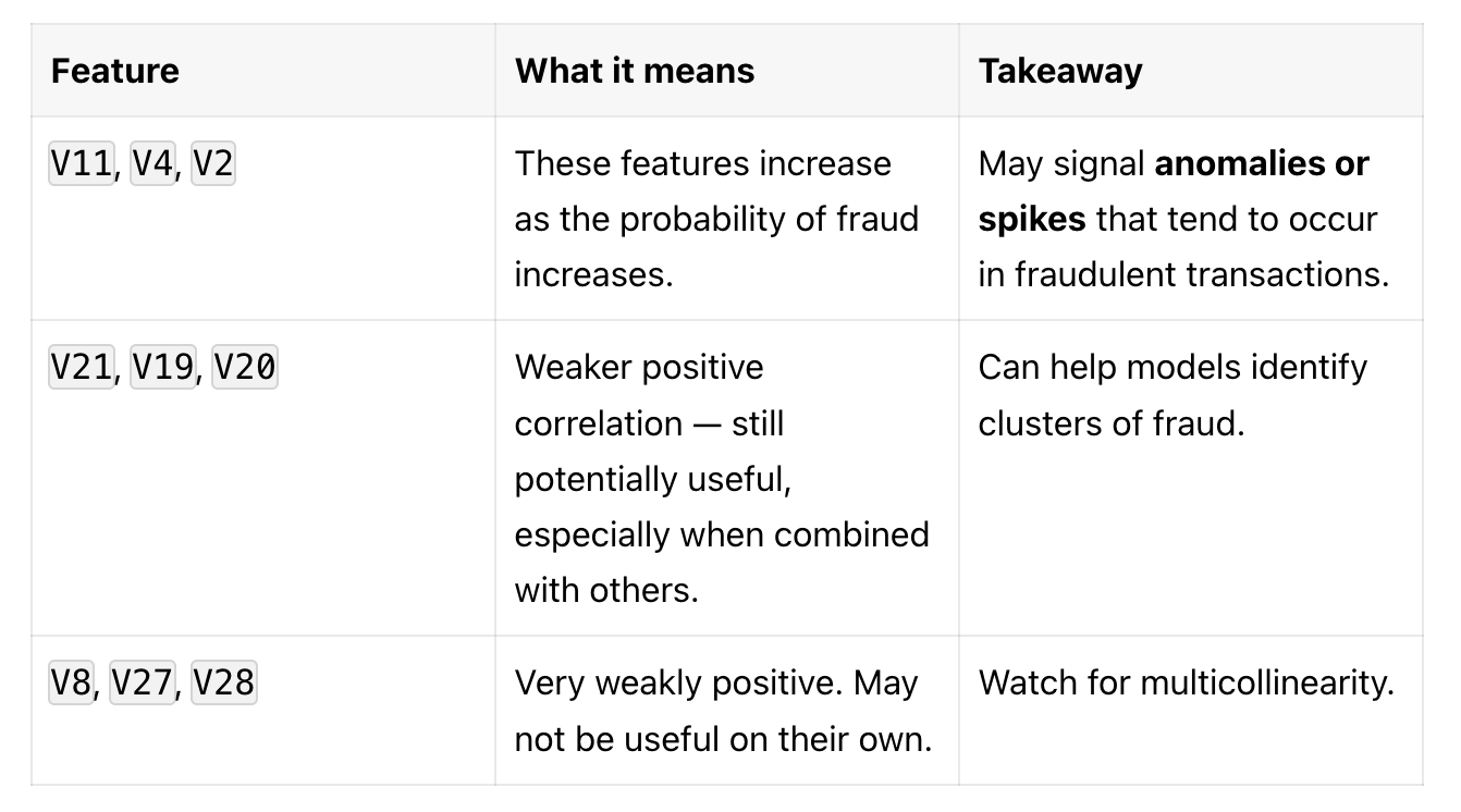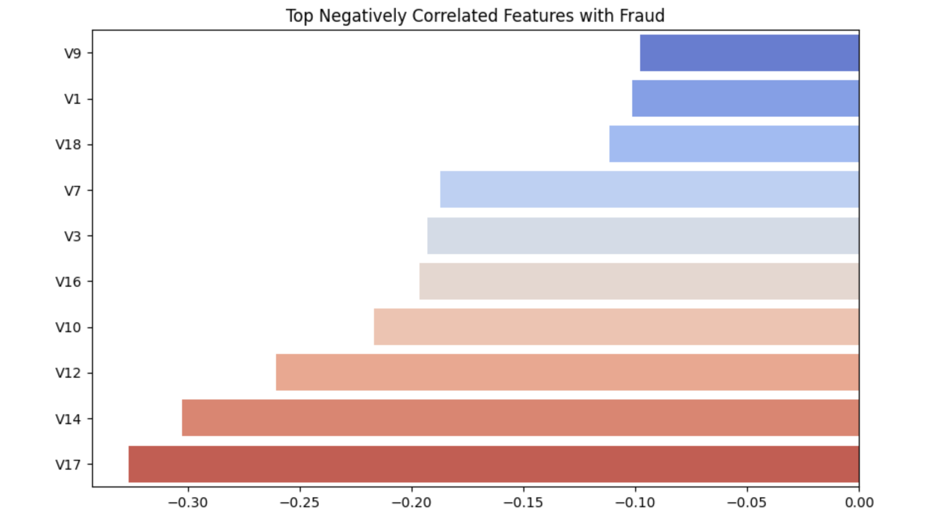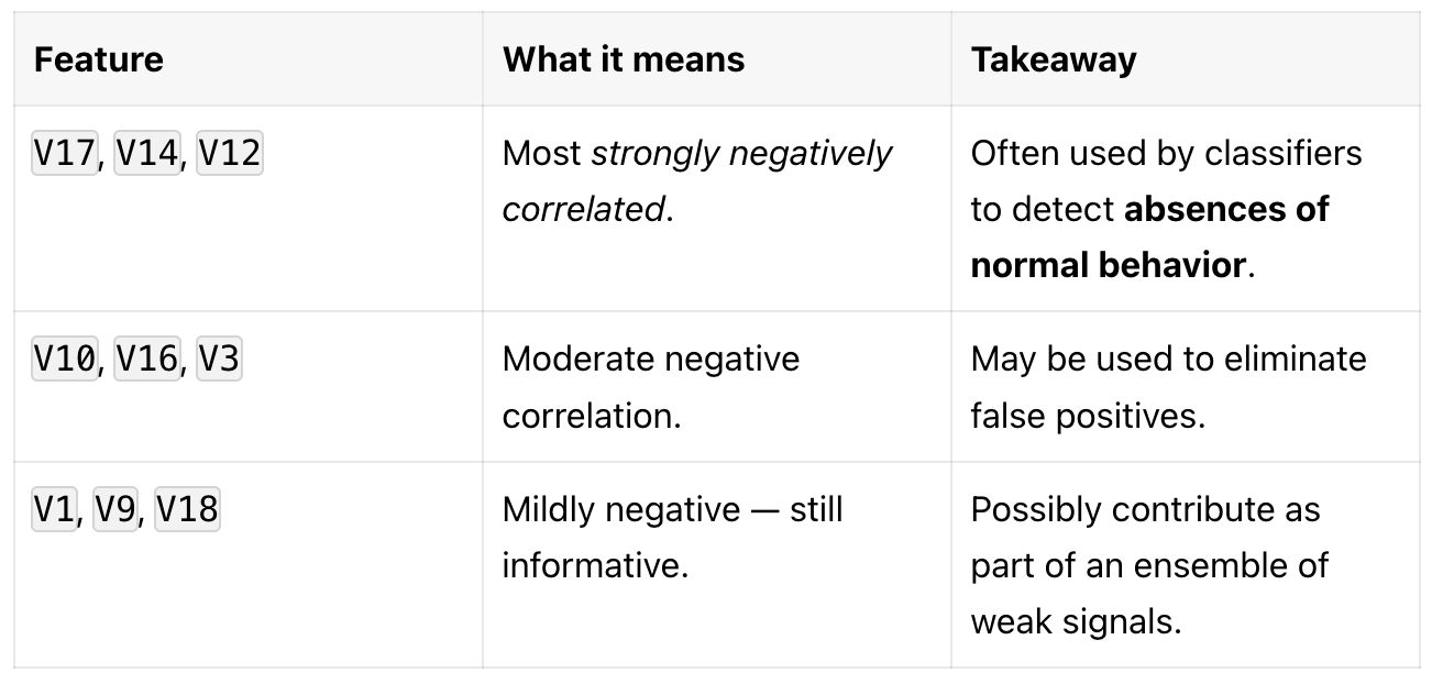 These features show a negative relationship with the fraud label — meaning their values tend to drop in fraud cases.