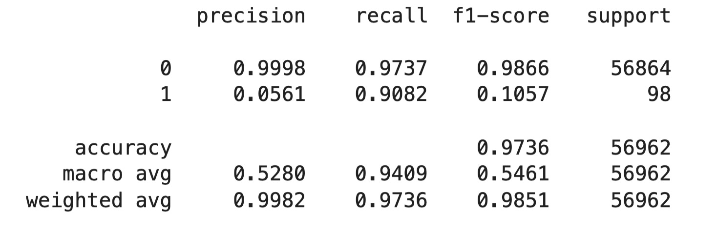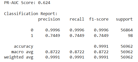 This gives precision, recall, and F1-score per class, so you see how well fraud cases (Class 1) are being handled.