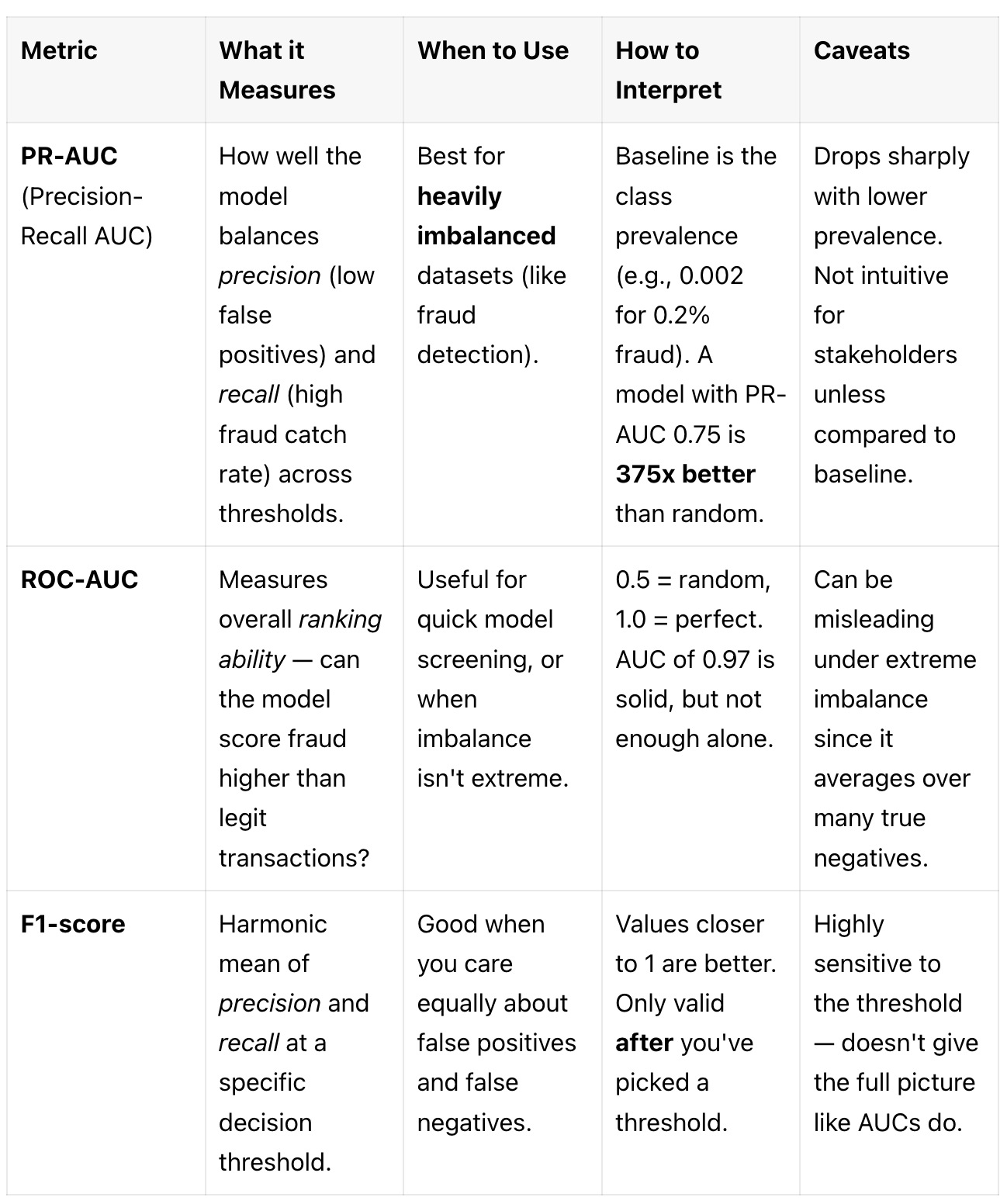 Rule of thumb: If positives ≪ negatives, prioritise PR-AUC for model selection and report confusion-matrix numbers at an operating threshold that meets business limits on false positives/negatives.