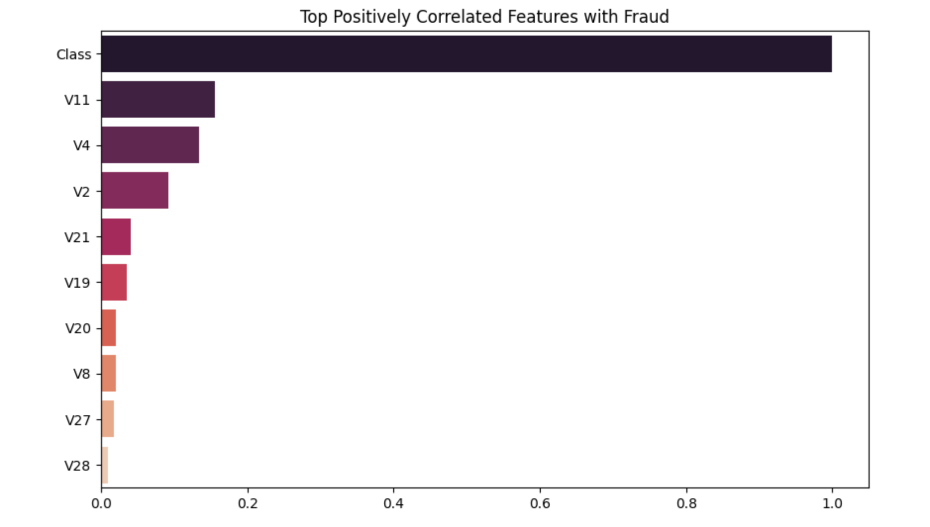 This plot shows which features have the strongest positive correlation with the fraud label (Class = 1