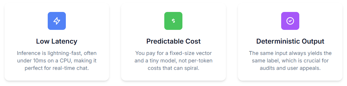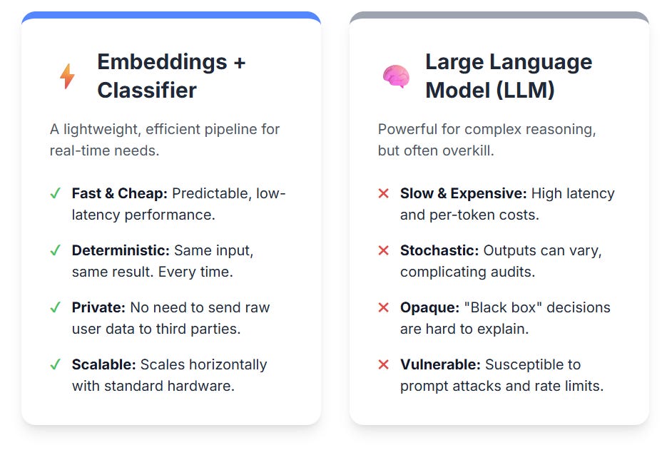 Why an embedding-plus-classifier pipeline trumps funneling every chat message through a giant LLM—think millisecond latency, predictable cost, and rock-solid determinism.
