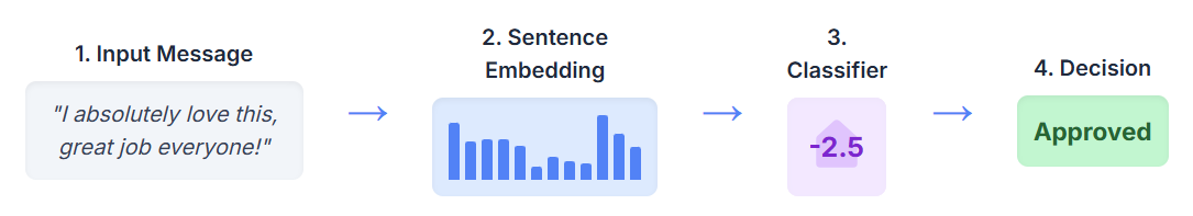 LLMs are still useful for low-volume, long-form reviews or as a second pass on borderline cases, but for a busy chat stream an embedding pipeline wins on speed, cost and predictability.