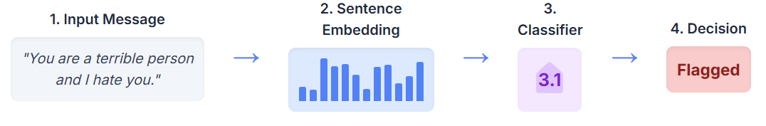 The following simple flowcharts illustrate how the pipeline processes and flags a message. A message is converted into a vector, scored by the classifier, and then a final decision is made based on the score.